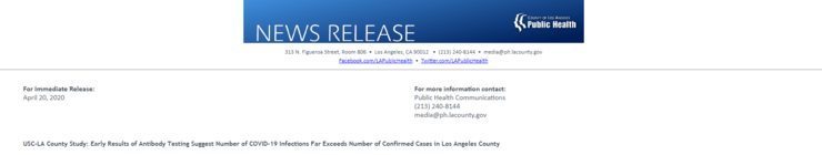 2020 年 4 月 20 日,加州洛杉矶县公共卫生部门在其官网宣布,与南加州大学合作进行了一项研究,研究成果题为 Seroprevalence of SARS-CoV-2 Specific Antibodies Among Adults in Los Angeles County(洛杉矶县成人中新型冠状病毒特异性抗体的血清流行病学研究)。