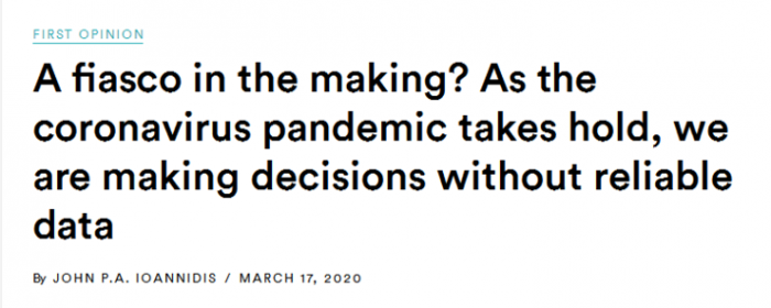 早在当地时间 2020 年 3 月 17 日,斯坦福大学人口健康研究人员 John Ioannidis 就通过美国生物医学新闻媒体 STAT 发声:
