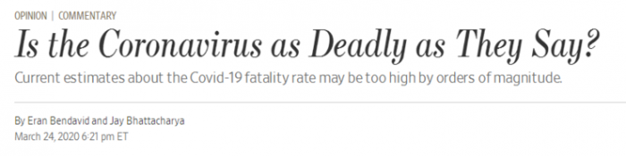 一周后,斯坦福大学卫生政策研究人员 Eran Bendavid 和 Jay Bhattacharya 于 3 月 24 日在《华尔街日报》上也发表了类似的观点。在题为 Is the Coronavirus as Deadly as They Say?(新冠病毒有他们说的那么致命吗?)的评论中,二人认为此前对 COVID-19 的死亡率估值(2%-4%)“存在严重缺陷”。