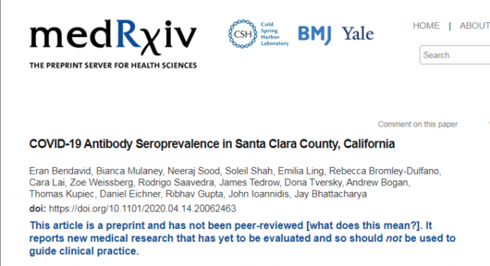 2020 年 4 月 17 日,斯坦福大学研究团队(成员包括上文提到的三位科研人员)题为 COVID-19 Antibody Seroprevalence in Santa Clara County, California(加州圣克拉拉县新冠肺炎抗体血清流行病学调查)的论文在线发表于预印本平台 medRxiv。