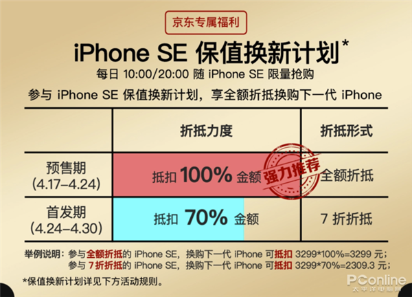保值换新计划内容如下:每日10:00/20:00随iPhone SE限量抢购,参与iPhone SE保值换新计划,享全额折扣换购下一代iPhone。预售期4.17-4.24抵扣100%金额,即可换购下一代iPhone 可抵扣3299元;4.24-4.30抵扣70%,最低可抵扣2309.3元。