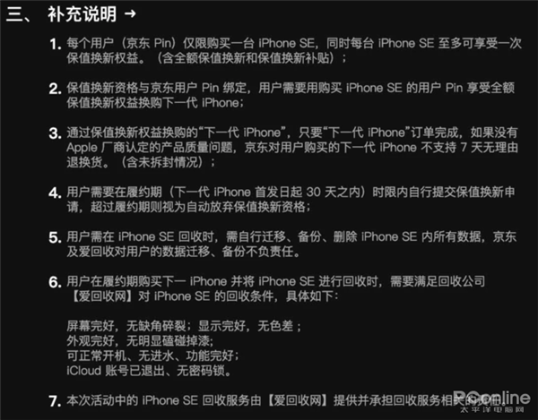 首先,参与保值换新抢购,你必须在新一代iPhone 出来之后一个月内向京东提出保值换新需求,同时京东也没有给出具体每天同一时间段有多少名额,消费者需要在下单后自行到订单中查看是否获得资格;其次,70%的折扣金额,你所购买使用的iPhone SE 需要满足爱回收的回收条件,具体如下: