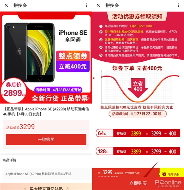 先说拼多多,拼多多这次可谓是第一个将iPhone SE(第二代)进行百亿补贴的电商之一,只要你能领到券价格直降400。