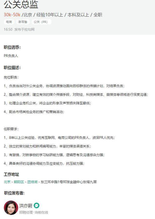 据悉,当当网招聘经理洪亦蔚今日下午对外发布招聘启事,拟以最高5万元月薪招聘一位公关总监。这一岗位职责除了整合媒介资源、对媒体进行深度沟通、配合市场及其他业务的贵广及营销活动之外,还包括处理企业危机公关,将企业的形象及声誉损失降至最低。