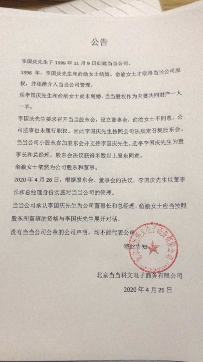 随后,李国庆方面在群内发布盖有当当公司公章的公告,再次强调根据股东会、董事会于4月26日的决议,李国庆以董事长和总经理身份实施对当当公司的管理。当当公司承认李国庆为公司董事长和总经理,俞渝应当按照股东和董事的资格与李国庆展开对话。