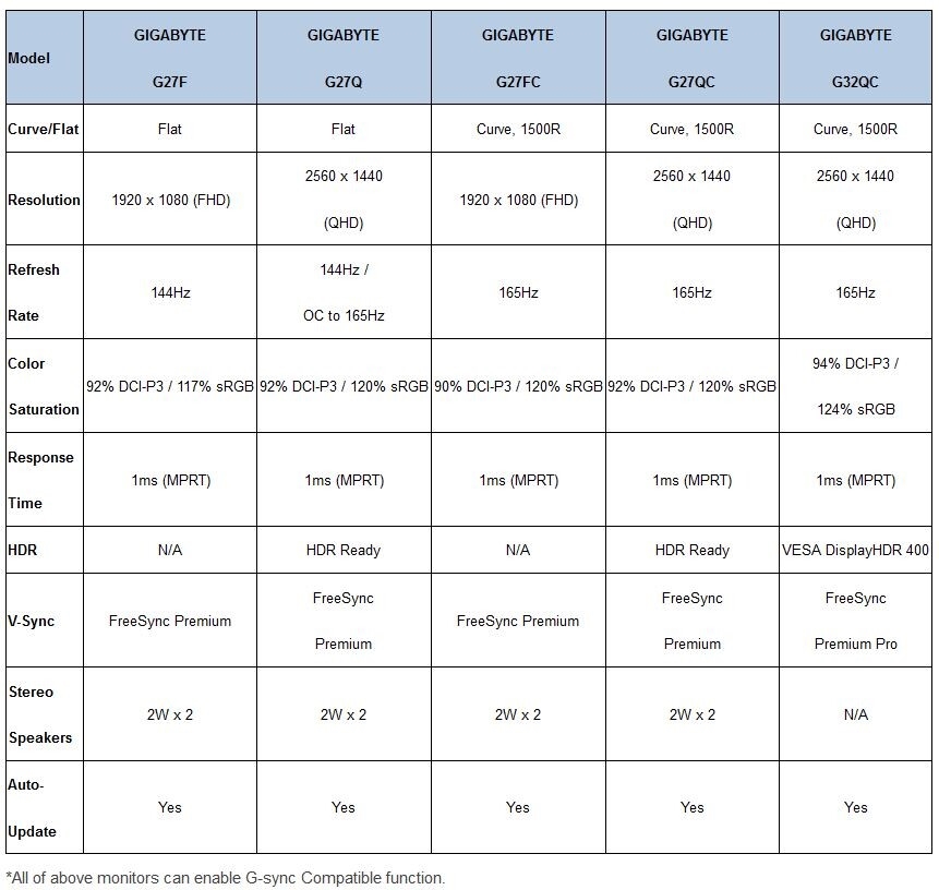 而技嘉G27FC、G27QC、G32QC是3款曲面显示器,曲率1500R,分辨率分别为27寸1080P,27寸1440P,32寸1440P,刷新率同样为165Hz。