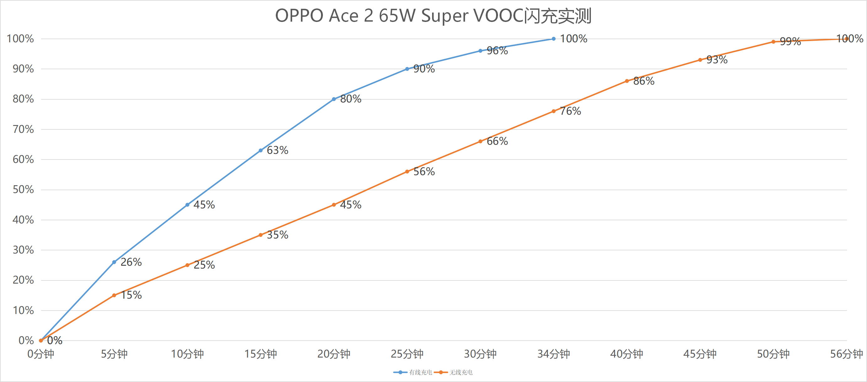 在完全耗尽电量自动关机后,小编做了有线和无线两种快充测试,在65W有线快充中5分钟达到26%,10分钟到达45%,完整充电只需要34分钟。40W AirVOOC无线闪充方面能做到10分钟 25%,56分钟100%充电效果。