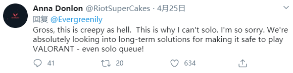 Evergreenily的推特诉苦很快得到了大量女性玩家群体的共鸣,而她的公司同事,也就是《Valorant》执行制作人Anna Donlon也很快对此作出回应。