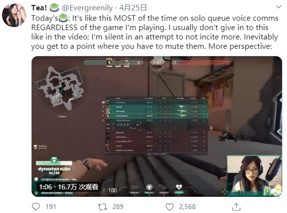 她在配文中写道:“不论我玩什么游戏,单排的语音频道交流总会变成这样。我通常不会像这次那样屈服,保持沉默是为了不煽动其更多的情绪。每次到最后都会不可避免的采取静音语音频道的做法。”
