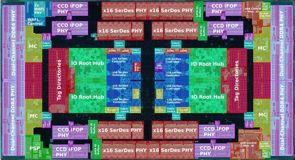 以“Matisse”为例,I/O裸片中拥有两个x16 SerDes主控(可同时管理PCIe、SATA、USB 3等接口)、一个I/O根核心、两个x16 SerDes物理层等。