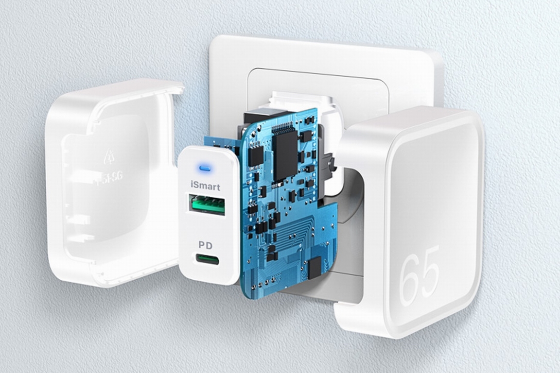 RAVpower 65W充电器内部使用了第三代半导体材料氮化镓功率器件,氮化镓高频高效特性在保持大功率的同时还能做到缩小产品体积,减少发热。