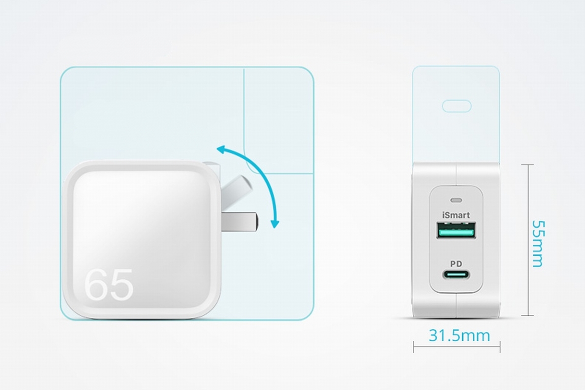 得益于氮化镓的加入,RAVpower 65W氮化镓充电器尺寸只有31.5mm * 55mm * 55mm,功率密度为0.68W / cm³。相比起苹果原装61W充电器体积大幅度缩减。