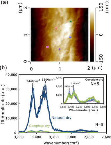 下图 a 是单个棉纤维的 AFM 图像,图片上 5 处五颜六色的标记表示 AFM–IR 的测量点。下图 b 为湿度 50% 时自然晾干(蓝线)和完全晾干(绿线)的毛巾的 AFM-IR 数据(实际上蓝线有两个明显峰值,绿线则没有,再一次证明了结合水的存在)。