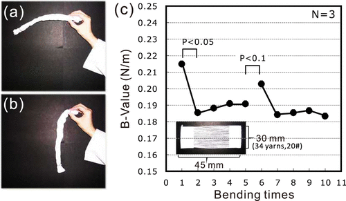 值得一提的是,日本本土目前对面料评估的体系为 KES-FB,因此在这一研究中,研究人员也是基于这一体系。图 c 便是利用 KES-FB 对上述两种毛巾弯曲力、软硬程度的评估。这一评估再次说明,由于结合水的存在,棉纤维由于弯曲而脱离连接。