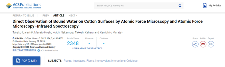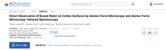 2020 年初,该研究团队在《物理化学杂志》在线发表了这一研究成果,论文题为 Direct Observation of Bound Water on Cotton Surfaces by Atomic Force Microscopy and Atomic Force Microscopy–Infrared Spectroscopy(基于原子力显微镜和原子力显微镜-红外光谱法直接观察棉花表面的结合水)。