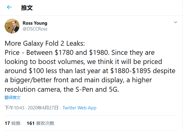 在价格方面,Galaxy Fold 2的售价似乎将在1780美元到1980美元之间。三星显然是希望提升Fold 2的出货量,并打算将其定价比原版Fold低100美元左右。这与之前的传言一致,之前也有传言称Galaxy Fold 2可能会比它的前代产品更便宜。尽管三星在Galaxy Fold 2上包括了更大的屏幕、S-Pen、改进的摄像头设置和5G连接,但较低的价格标签还是会存在。