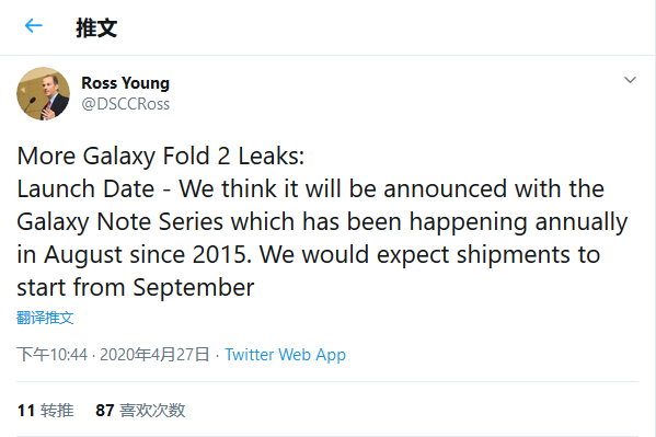 本月早些时候的一份泄露消息称,Galaxy Fold 2将配备更大、120Hz主显示屏、超薄玻璃、S-Pen支持等。预计Galaxy Fold 2将于今年8月与Galaxy Note20系列一起推出,并预估这款设备将从9月份开始出货。