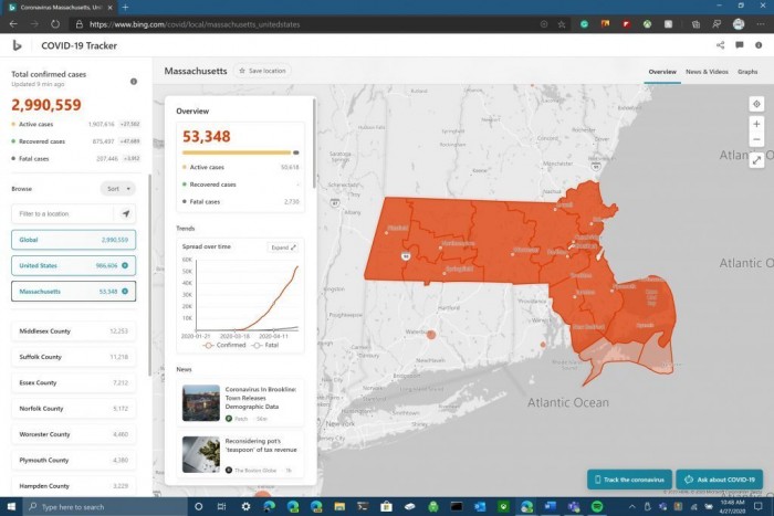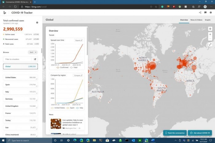 据外媒报道,Bing最近推出了COVID-19(新冠病病毒)追踪器,其提供了全球和本地新冠病毒信息,这一个工具受到了来自不少媒体的好评。正如Mashable的一篇文章所指出的那样,Bing拥有“最好冠状病毒追踪器”的经验,这为追踪新冠病毒病例提供了全面的统计数据。