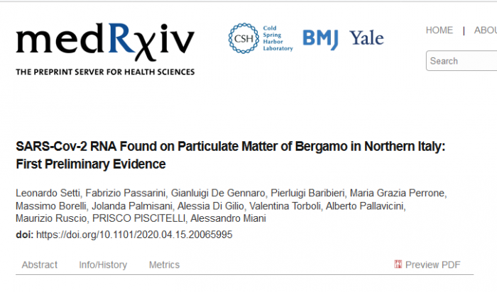 目前科研人员发现新冠病毒可以和空气中的污染颗粒结合[PDF],目前意大利科学家正在北部重灾区贝加莫周围的的空气,他们从贝加莫的一个城市和一个工业基地收集了空气,并在多个样本中发现了COVID-19的特异性基因。该研究的一个早期版本尚未经过同行评审,已经发表在medRxiv上。