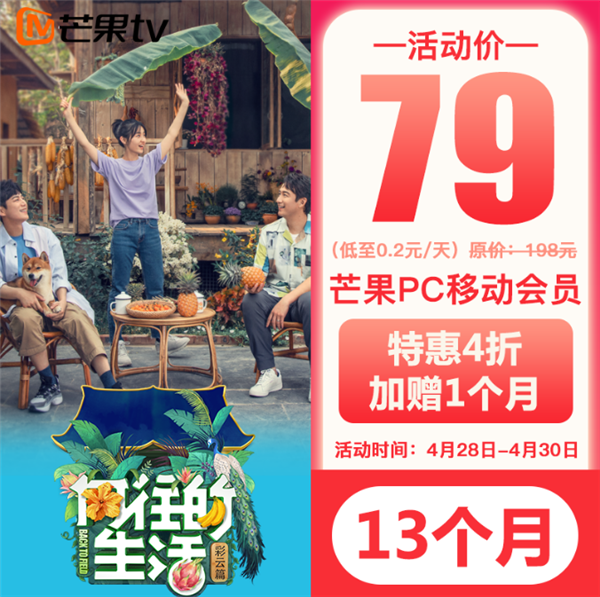 五一小长假来了,不过鉴于疫情仍未过去,宅家追剧不失为一种理性选择。4月28日-30日,芒果TV会员推出4折优惠,原价198的年卡只要79元!加赠一个月共13个月,每天不到2毛即可享受VIP(非TV端)。