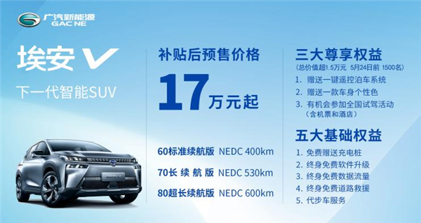 目前官方对新车动力信息描述的不多,此前的工信部申报信息显示,Aion V将由永磁同步电机驱动,最大功率184马力,峰值扭矩350牛·米。