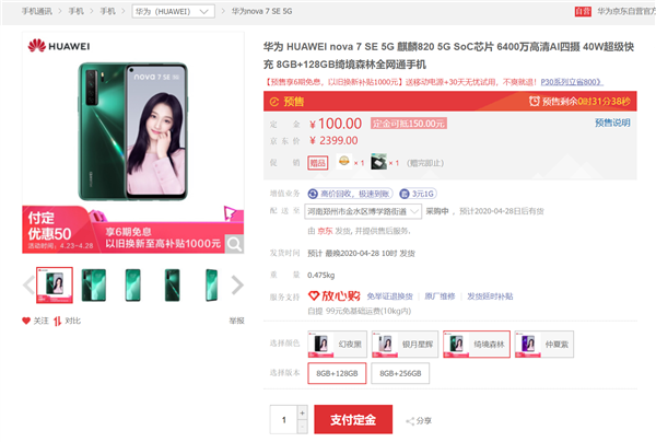 4月28日消息,华为nova7系列将在今天上午10:08正式发售。售价方面,nova7 SE 8GB+128GB版售价2399元,8GB+256GB版售价2799元,提供幻夜黑、银月星辉、绮境森林、仲夏紫四种配色。