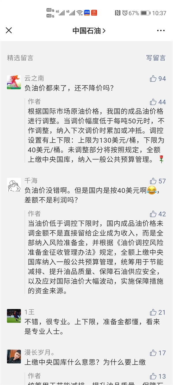 有网友问道:“负油价都来了,还不降价吗?”中国石油回应称:“根据国际市场原油价格,我国的成品油价格进行调整。当调价幅度低于每吨50元时,不作调整,纳入下次调价时累加或冲抵。调控设置有上下限:上限为130美元/桶,下限为40美元/桶。未调整部分将按照规定,全额上缴中央国库,纳入一般公共预算管理。”