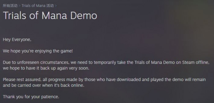 因为意料之外的情况,我们需要暂时下架Steam平台上的《圣剑传说3:重制版》Demo。我们会尽快让它重新上架。