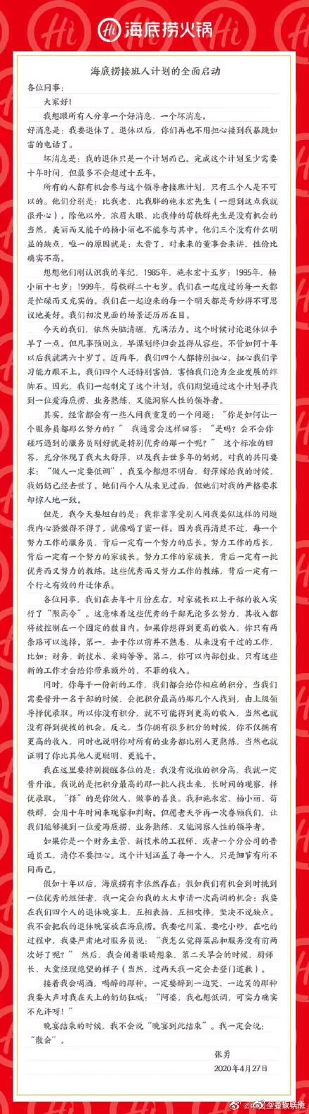 张勇在内部信中说:“今天的我们,依然头脑清醒,充满活力。这个时候讨论退休似乎早了一点。但凡事预则立,早谋划终归会显得从容些。不管如何十年以后我就满六十岁了。近两年,我们四个人都特别担心,担心我们学习能力跟不上。我们四个人还特别害怕,害怕我们沦为企业发展的绊脚石。因此,我们一起制定了这个计划。我们期望通过这个计划寻找到一位爱海底捞,业务熟练,又能洞察人性的领导者。”