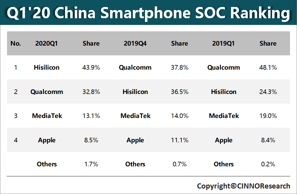 从品牌表现上看,海思成为了中国市场唯一一家在第一季度出货量未同比下滑的主要品牌,出货量2,221万片,与2019年第一季度的2,217万片基本同比持平,因此在斩获了43.9%的市场份额同时,也首次超过高通,正式成为中国市场出货量最大的手机处理器品牌。高通、联发科、苹果分列二、三、四位。