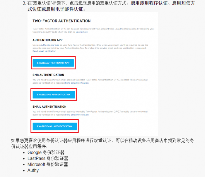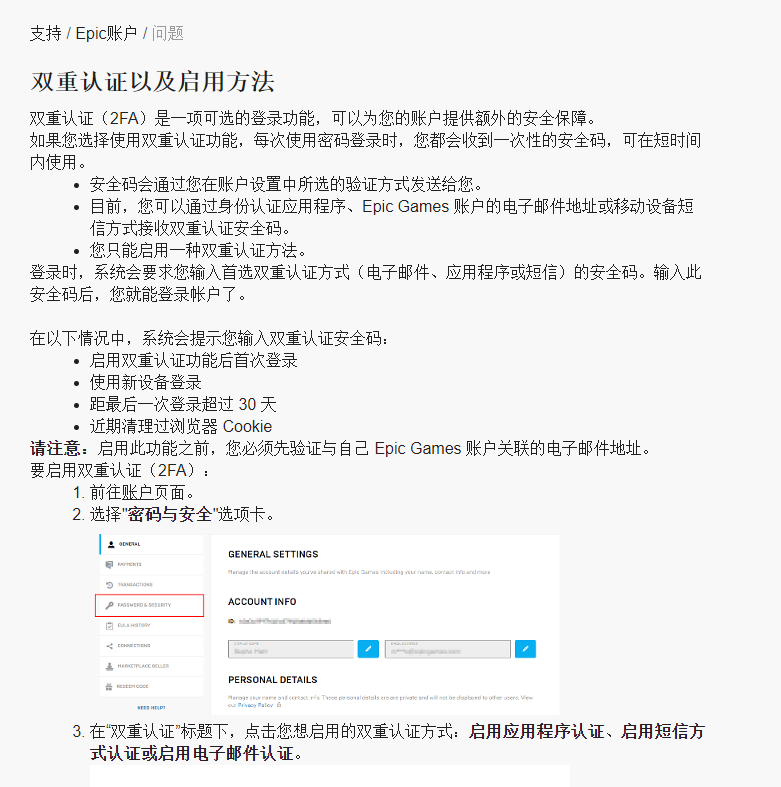 若欲启用双重认证 ,请前往您的Epic Games帐号设定。双重认证能透过要您在登入时输入安全码,保护您的帐号不受未经授权的来源登入。您可以在此处阅读如何启用双重认证的完整说明。