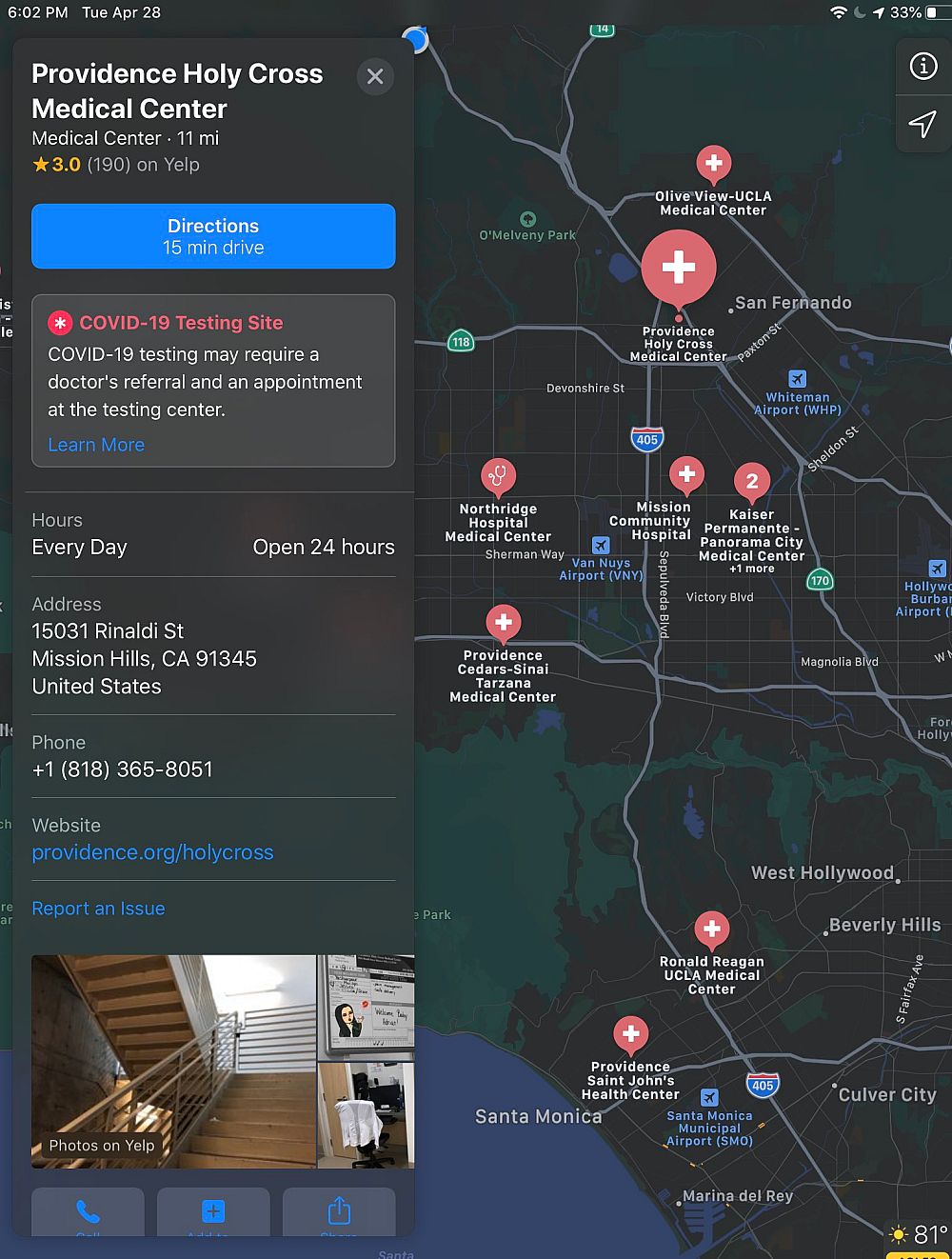 点击该选项,将弹出用户当地的COVID-19测试机构列表。除了每个被审查的机构的时间、地址和联系信息外,信息窗格还显示了检测是否需要医生转诊或预约。