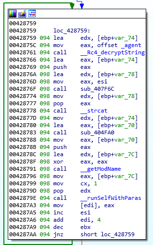 (3)参数-agent<IndexInReg>:搜索参数下标对应注册表中的磁盘,对可加密文件进行加密。病毒中的字符都通过RC4流对称加密算法进行加密,待解密数据前 32 字节为 Key, 其余字节为密文。