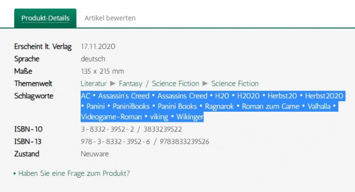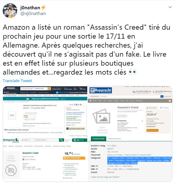 网友j0nathan在推特上发文称,最近德国亚马逊商城上架了《刺客信条》新小说,小说将于11月17日发布,标签里有“瓦尔哈拉”“诸神黄昏”等词,这与之前网传的维京背景相吻合。j0nathan还表示他进行了核实,这些信息不是伪造的。