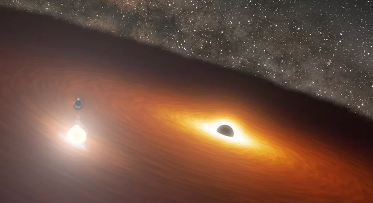 每隔12年,较小的“舞伴”就会撞穿一个巨大的碎片盘,围绕着超大规模黑洞旋转。当它这样做的时候,它会产生一个我们在地球上可以看到的巨型耀斑,因为它比一万亿颗恒星还要亮。美国宇航局喷气推进实验室完美地捕捉到了这一现象。