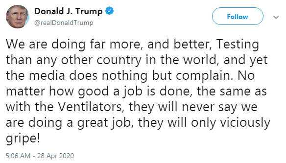 在白宫疫情发布会上,一名记者问特朗普是否有信心美国每天能进行500万次检测,一些健康专家表示,这是美国“重新开放”所需要的。