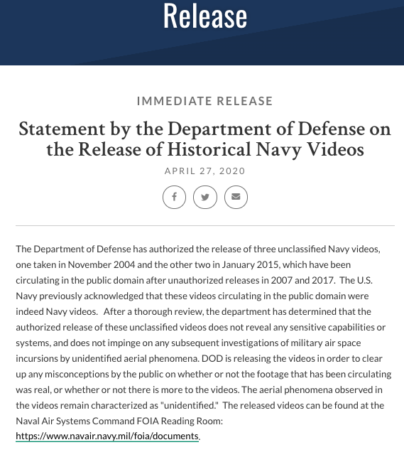 2020 年 4 月 27 日,美国国防部在官网正式发布了三段视频,以美国政府官方名义来证明视频的真实性。在官网上,美国国防部表示: