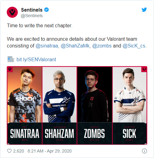 Sentinels 在 Twitter 上宣布了自家《Valorant》战队的新名单,并且正在努力凑齐另外五名成员。