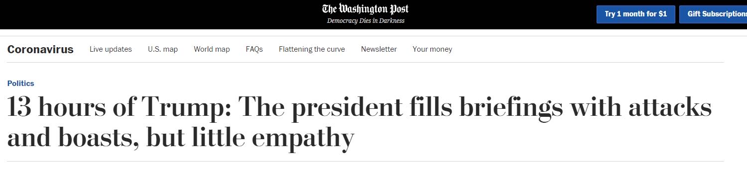 文章根据一家数据分析公司的统计报告指出,在过去三周(4月6—24日),特朗普主持了22场记者会,发言时间超过13个小时,其中攻击别人的时间多达2个小时,在他回答的346个问题中,特朗普在113个问题中攻击了他人,占他回答问题的三分之一;称赞自己和他领导的联邦政府的时间达45分钟;对新冠肺炎病亡者表示哀悼的时间仅有4.5分钟。传染病学专家安东尼·福奇在22场记者会上的发言时间累计仅有两个多小时。