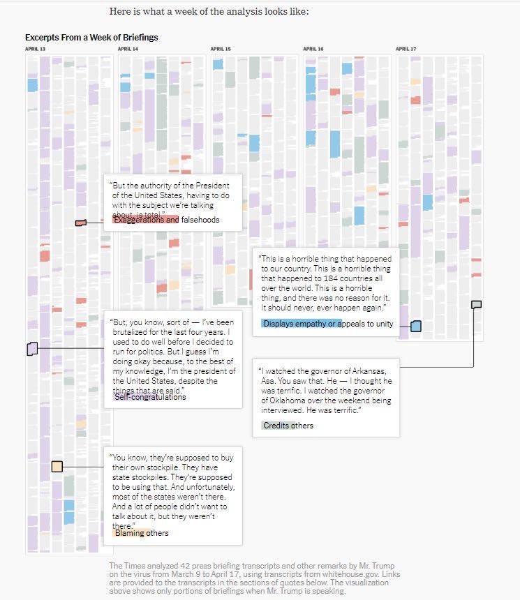 《纽约时报》回顾了疫情期间(从3月9日到4月中旬),特朗普在白宫简报会及其他场合发表的针对疫情的所有言论,超过26万个单词。记录显示,他传达的信息出现多次重复,显示出总统的傲慢和对疫情蔓延的牢骚。