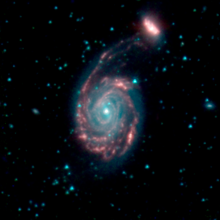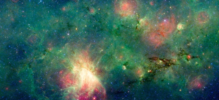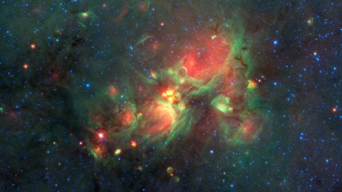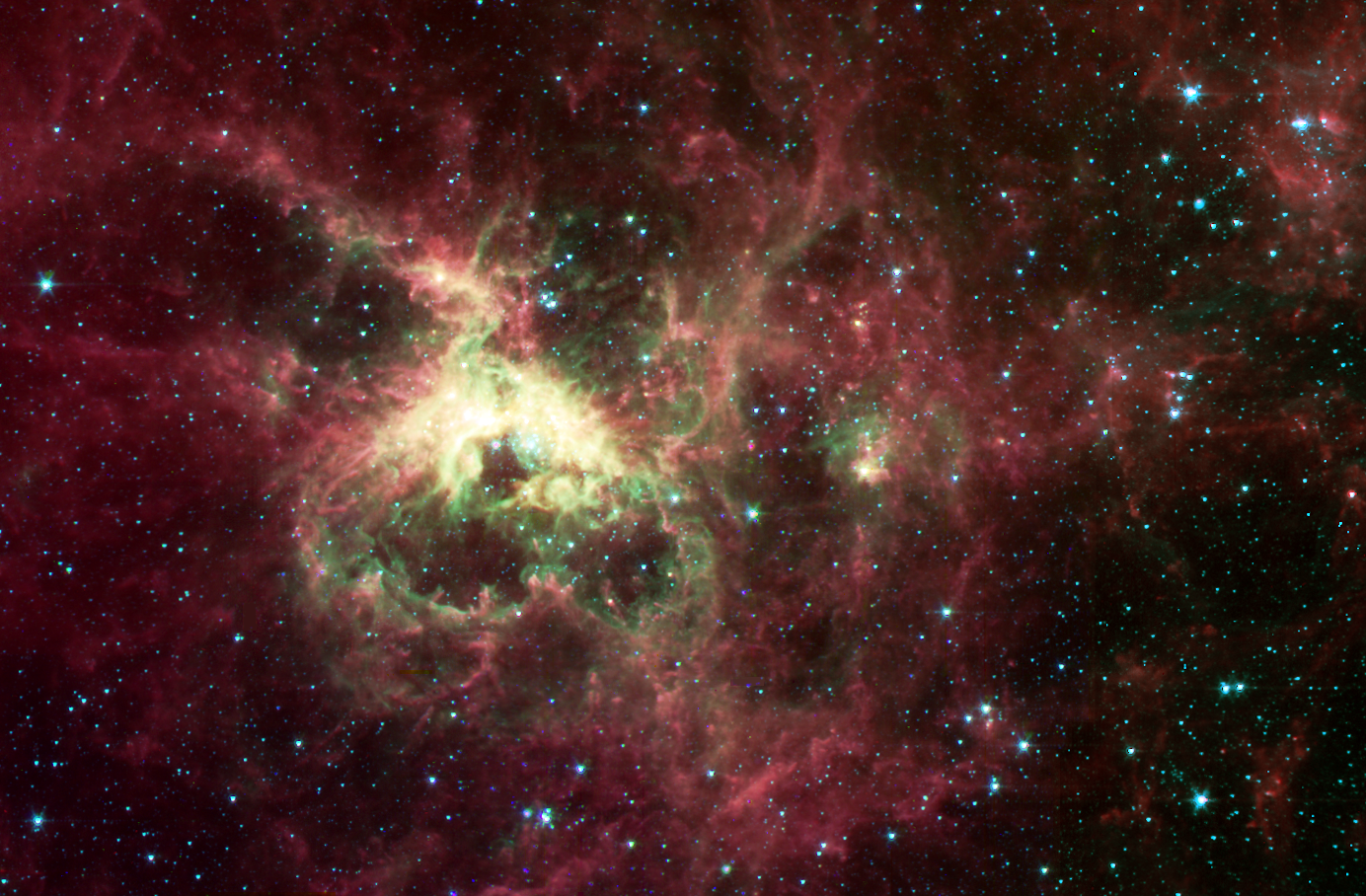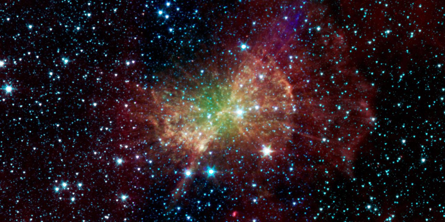 据了解,斯皮策使用三种不同波长的红外线捕捉宇宙,每种红外线都有着不同的颜色。其中,蓝色区域代表3.6微米的波长,绿色和红色则分别为4.5微米和8微米。这使得斯皮策望远镜拍摄的图像能够呈现出一种绚烂的色彩。