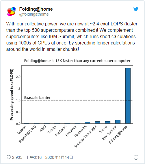 自新冠病毒大爆发以来,Folding @ home 分布式网络的算力已经增长了 1200% 以上。峰值接近了 2.5 exeFLOPS,甚至超越了 Top500 超算。