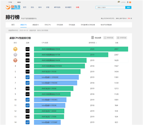 根据快科技天梯榜,主流级别16核心32线程的锐龙9 3950X,都已经可以在综合性能上略微胜出Intel的发烧旗舰、18核心36线程的酷睿i9-10980XE,整个撕裂者家族都在和自己玩,或者只能去找服务器上的至强白金。