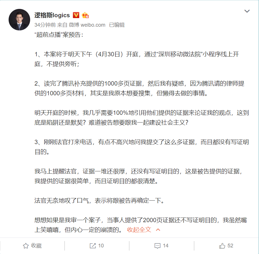 4月29日消息,当事人@逻格斯logics表示,腾讯视频超前点播一案将于明天下午开庭审理,通过“深圳移动微法院”小程序线上开庭,不提供旁听。