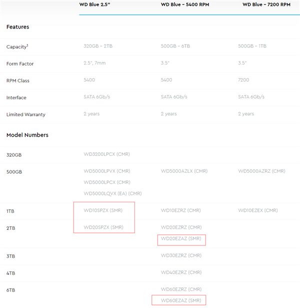 随后希捷、西数、东芝都公布了SMR硬盘的具体型号。对西数来说,3.5寸蓝盘中的2TB(WD20EZAZ)、6TB(WD60EZAZ)为SMR、2.5寸蓝盘中的1TB(WD10SPZX)、2TB(WD20SPZX)是SMR,2.5寸黑盘中的1TB(WD10SPSX)也是SMR。
