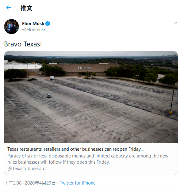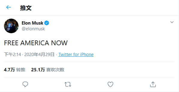 他还在电话会议上说:“我们认为就地避疫令是不顾宪法权利,强行将人们关在家中。在我看来,这种破坏人民自由的方式很可怕,很错误,这绝不是人们来到美国或建设这个国家的原因。这是彻底的暴行。这会带来损失,产生巨大的破坏,不仅对特斯拉,对所有公司都是如此。虽然人们可以熬过这场风暴,但很多小公司可能活不下去。”