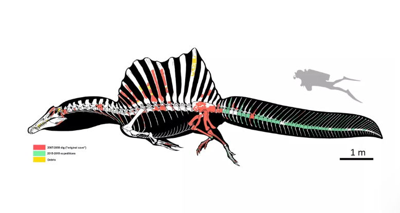 加拿大皇家泰瑞尔博物馆的古生物学家Donald Henderson认为,棘龙头重脚轻,能漂浮得相当不错,但这种庞然大物不太可能在水下沉没和追逐猎物。而周三发表在《自然》杂志上的一项新研究表明,棘龙肯定是个游泳高手。得益于2018年年底发现的各种新骨头,研究人员已经能够重建棘龙的尾巴,证实了它是一个游泳高手,能够在水面下操纵和追捕猎物的说法。