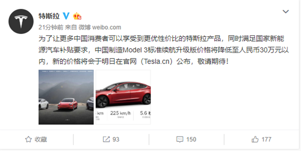 今日早间,特斯拉官方发布消息称,为了让更多中国消费者可以享受到更优性价比的特斯拉产品,同时满足国家新能源汽车补贴要求,中国制造Model 3标准续航升级版价格将降低至人民币30万元以内,新的价格将会于5月1日在官网公布 。