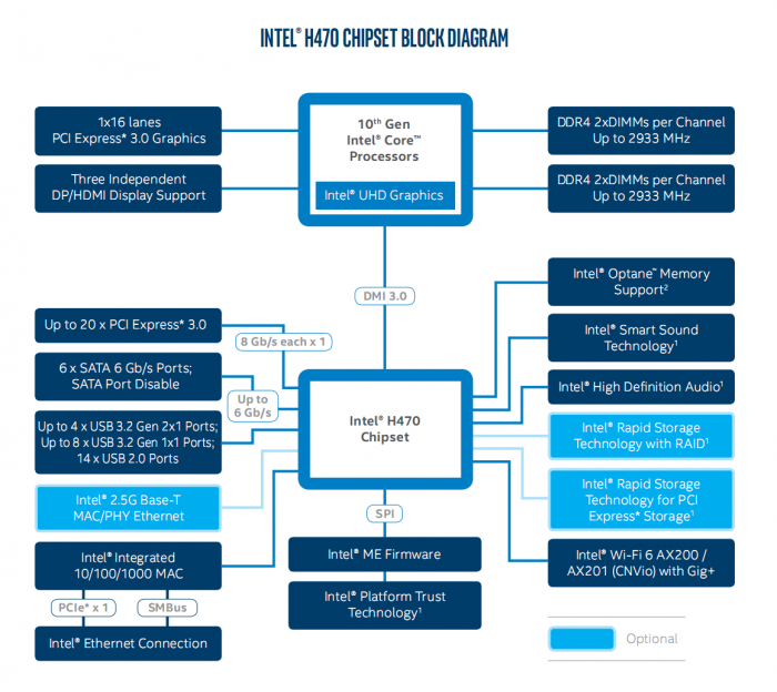 H470芯片组类似也是加入了2.5千兆有线网络、Wi-Fi 6无线网络,不过后者搭配的方案可选AX200、AX201,当然依然都是选配,具体看主板厂商如何设计。