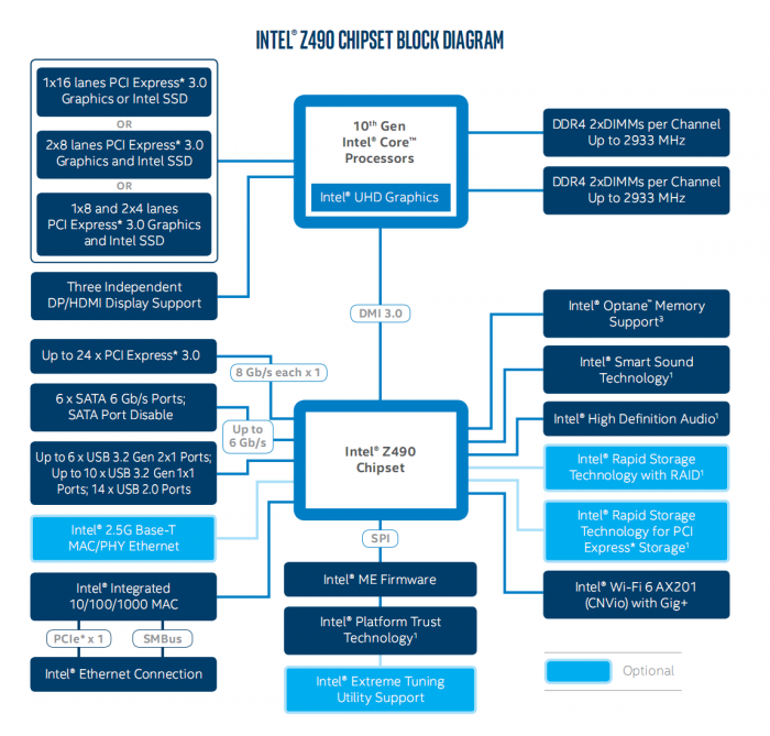 其他方面,Z490相比于Z390并没有什么明显变化,包括DMI 3.0互连总线、24条PCIe 3.0通道、6个SATA 6Gbps接口、6个USB 3.1接口、10个USB 3.0接口、14个USB 2.0接口。